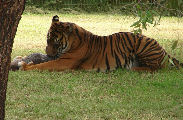 and naturally the tiger chose to eat it's meal way back from the audience, in the shade of a tree